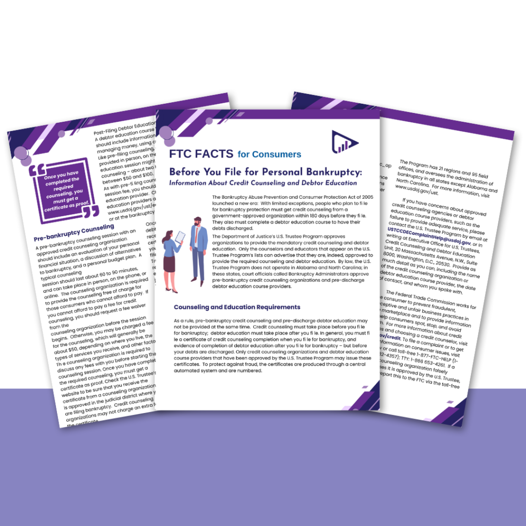 Before filing for bankruptcy, you must complete credit counseling from a government-approved organization within 180 days. Completing a debtor education course is also required to have debts legally discharged.